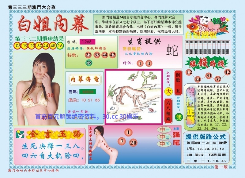 | 335期《白姐九肖》 综合九肖♘:狗马鸡兔蛇牛羊猪龙 综合七肖♘:狗马鸡兔蛇牛羊 综合五肖♘:狗马鸡兔蛇 主攻特码♘:08.44.36.48.09.33.03.39.01.49 ![]() |