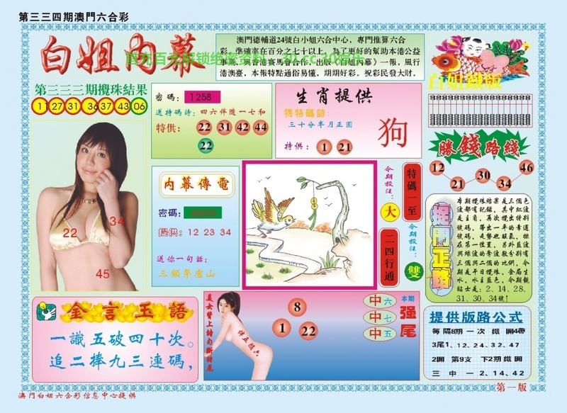 | 338期《白姐九肖》 综合九肖♘:鼠牛鸡虎猪猴狗马兔 综合七肖♘:鼠牛鸡虎猪猴狗 综合五肖♘:鼠牛鸡虎猪 主攻特码♘:30.42.05.17.09.21.16.40.07.43 ![]() |